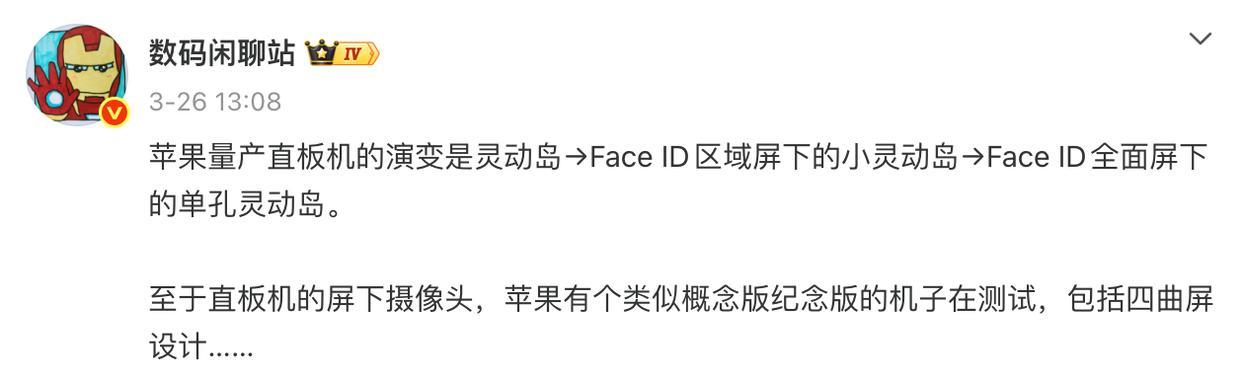 根据博主@数码闲聊站 的爆料,iPhone 直板机的屏幕演变过程是:灵动岛→小灵动岛→单孔灵动岛,最终目标是实现前摄和 Face ID 全面屏下的真全面屏设计。